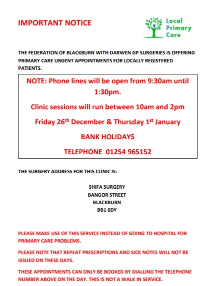 Blackburn with Darwen GP surgeries will be offering urgent care appointments on Friday 26th December and Thursday 1st January- This will be by appointment only.